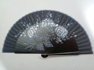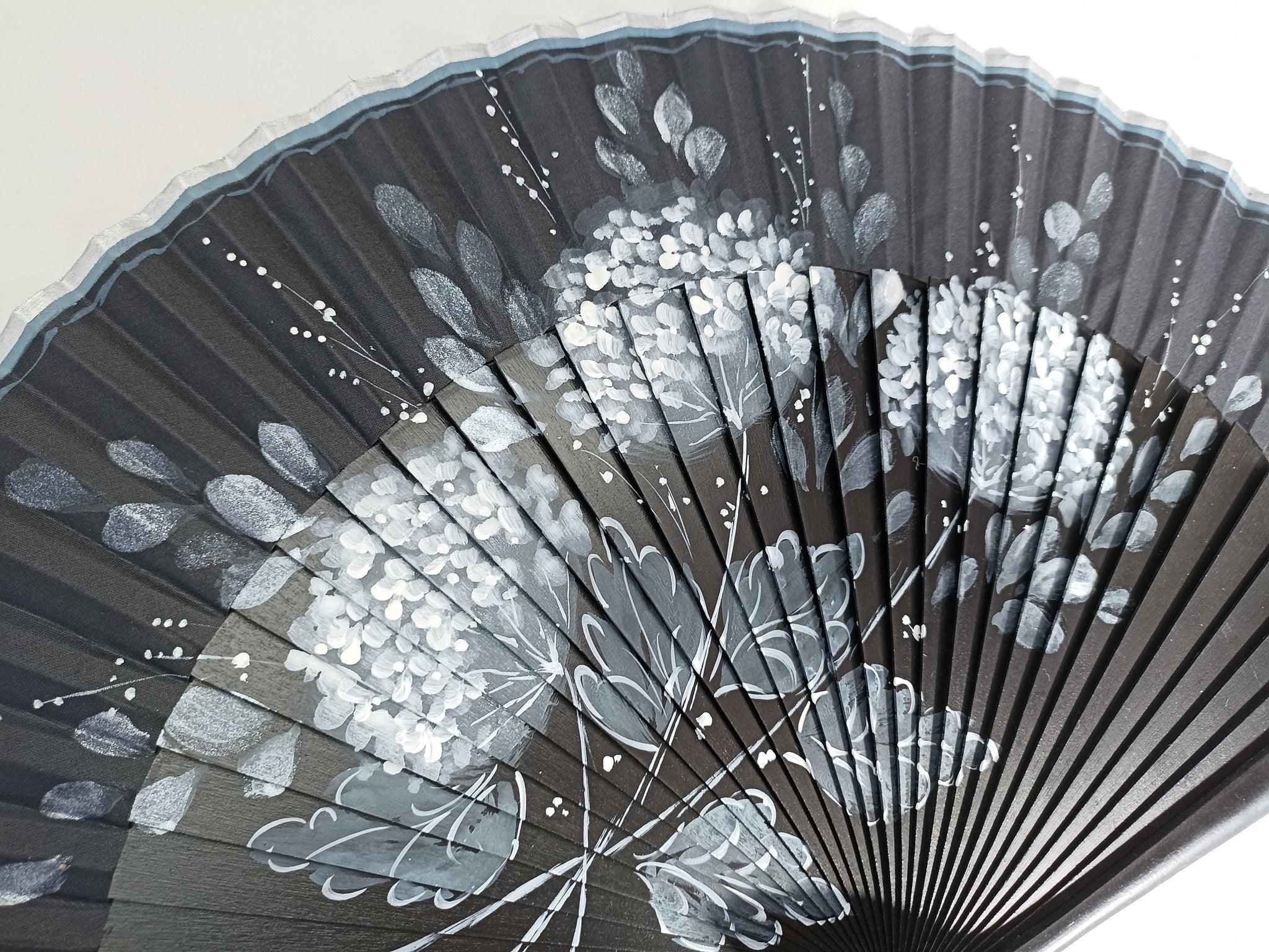 Abanico de madera de abedul .Tamaño 23 cm. Fondo y tela en negro. Flores y decoración en blancos, grises y plata. Personalizable con el nombre que quieras.
